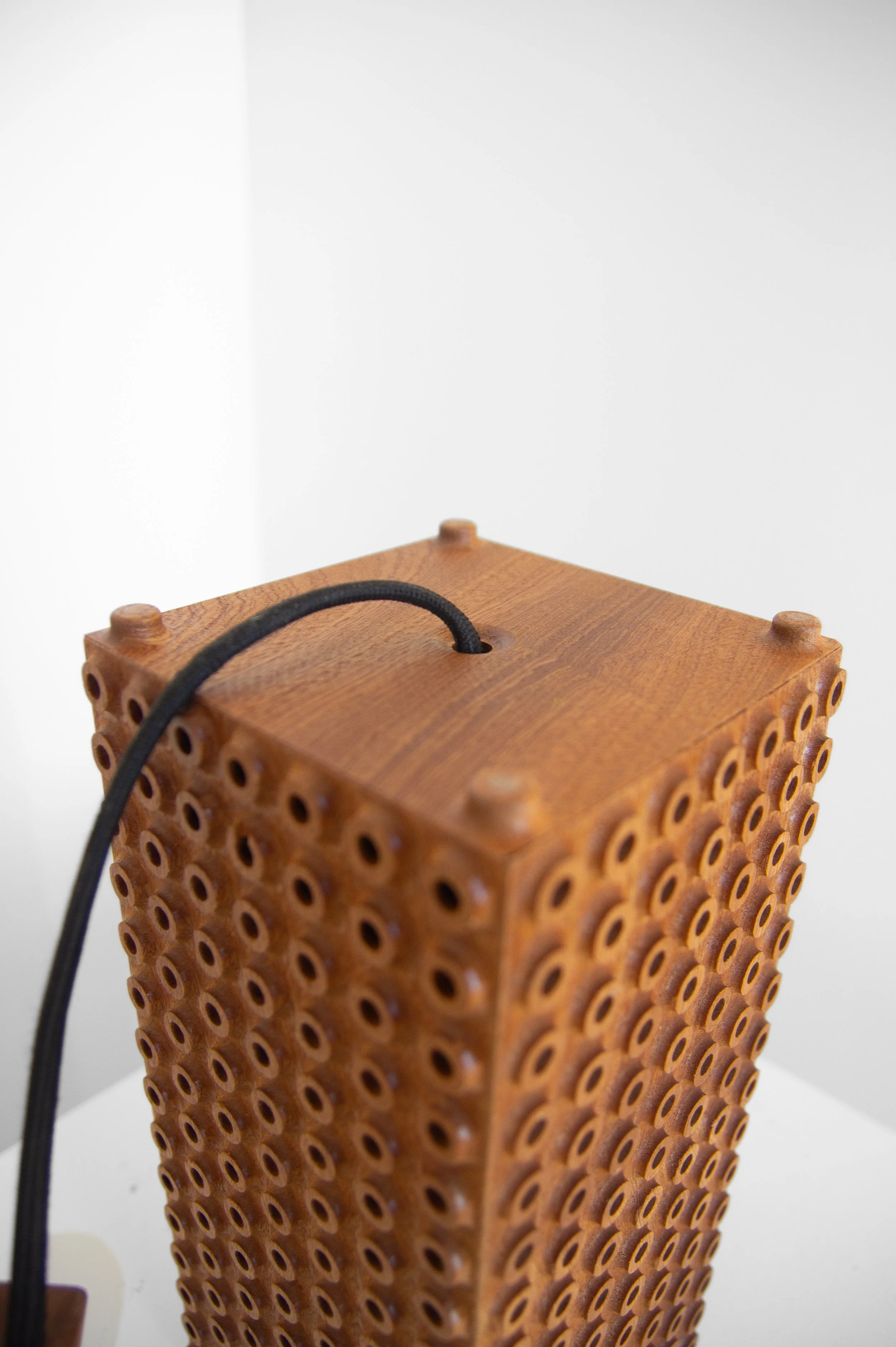 An exploration in surface texture created using a single CNC toolpath with a ball end mill. The rounded tip of the bit forms a concave conical pattern that gives a tactile eeriness, reminiscent of octopus tentacles. It feels like something that could sit on Davy Jones’ desk or like a block of wooden Cheerios for the cereal lovers.